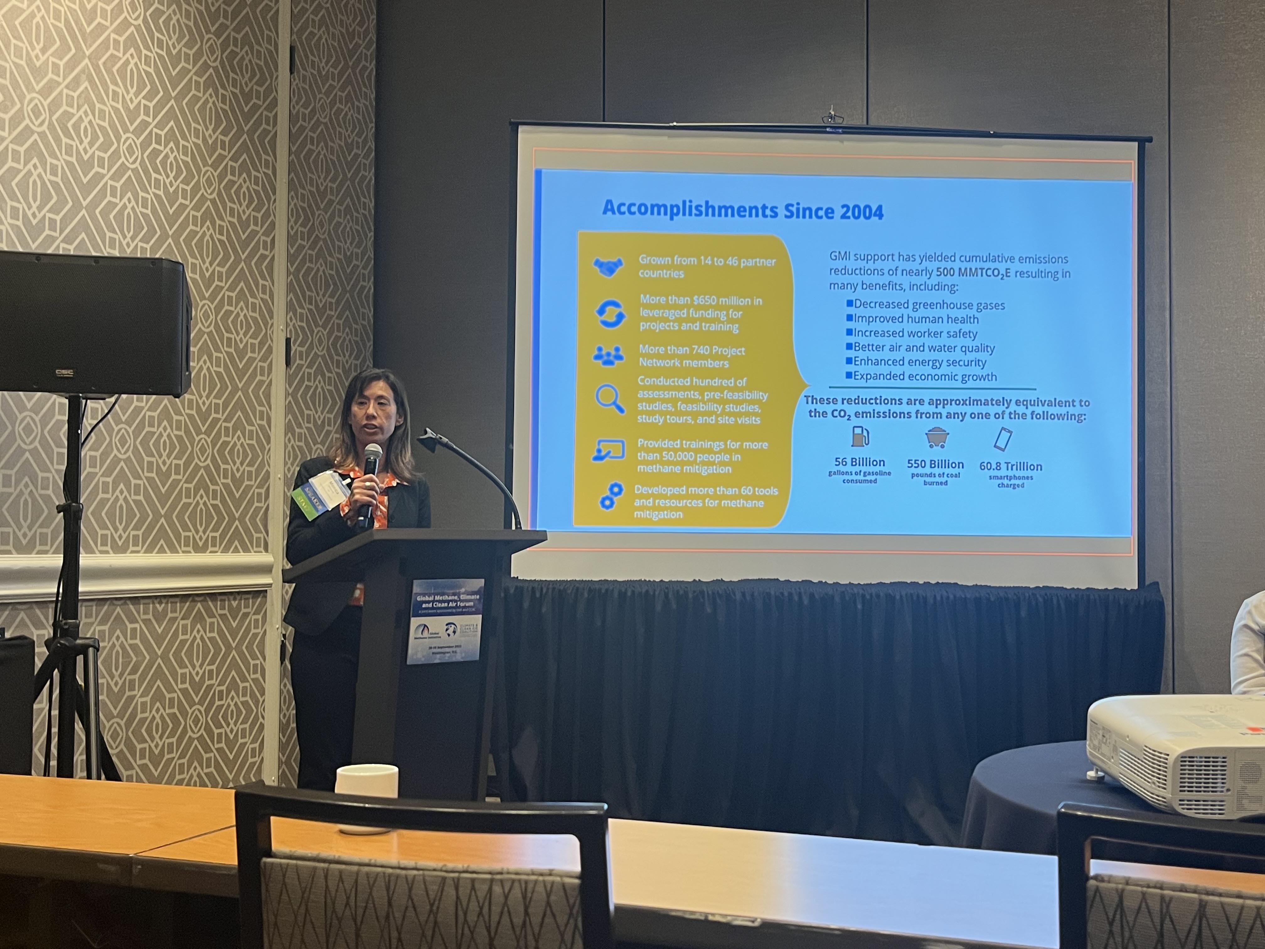 2022 Washington, D.C., United States Monica Shimamura, former director of the GMI Secretariat, presenting at the 2022 Global Methane Forum in Washington, D.C., United States.